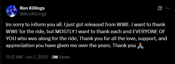 Ron Killings has posted on his Twitter today that he was released from WWE. Several WWE talent have posted their thoughts, tributes and thanks to R Truth in response to his post.